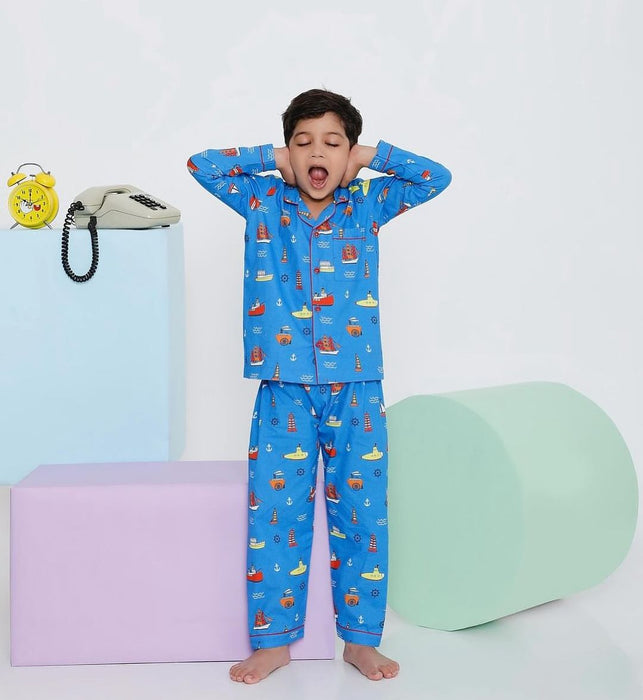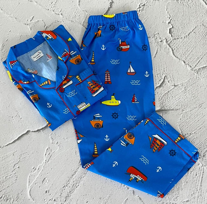 This nautical print sleep set includes a full-sleeved collared shirt with button front opening and a pyjama with an elastic waistband for a comfortable fit. The shirt can be made half sleeves upon request.