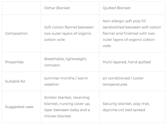 Our light and airy dohar/Muslin blankets work well as receiving blankets or stroller blankets. Our quilted blankets make sure your chubby cheekers stay warm and cosy, they work better for air conditioned and cooler temperatures.