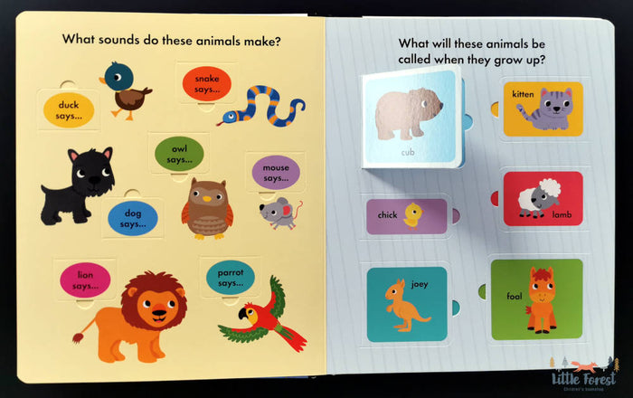 This lift-the-flap first words book introduces children to all kinds of animals, from those in the forest and jungle to pets found in the home.