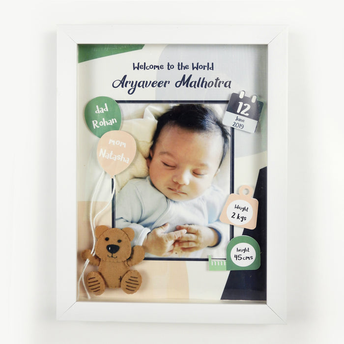 - لتخصيص الإطار، يرجى تقديم كل هذه التفاصيل في المساحة المتوفرة: الاسم الكامل، تاريخ الميلاد، مكان الميلاد، الوقت (صباحا/مساء)، الطول بالسنتيمتر، الوزن بالكيلوجرام أو الرطل وأسماء الوالدين