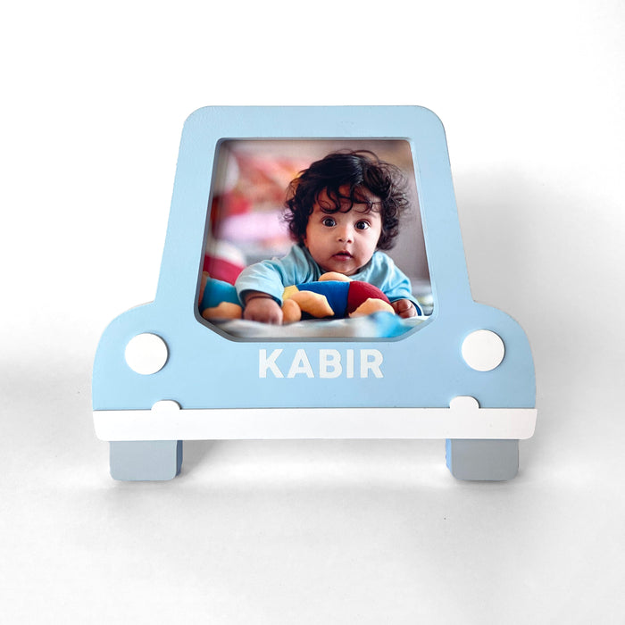 Meet our handcrafted wooden baby picture frames that make an ideal piece to place almost anywhere in your little one's nursery. This exclusive car themed baby photo frame in a blue hue is personalised, conveniently sized & perfect to place on a side table, shelf or make do as part of a baby boy arrival gift hamper.