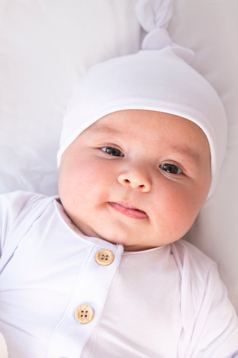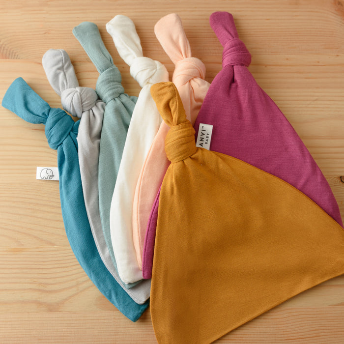 Anvi baby knotted hats are made from silky smooth bamboo material and stretchy spandex allowing them to fit comfortably on your baby’s head while being snug enough to stay on all day. The beanie is breathable, beautifully soft, and gentle on your baby’s scalp - a must-have for those early days.