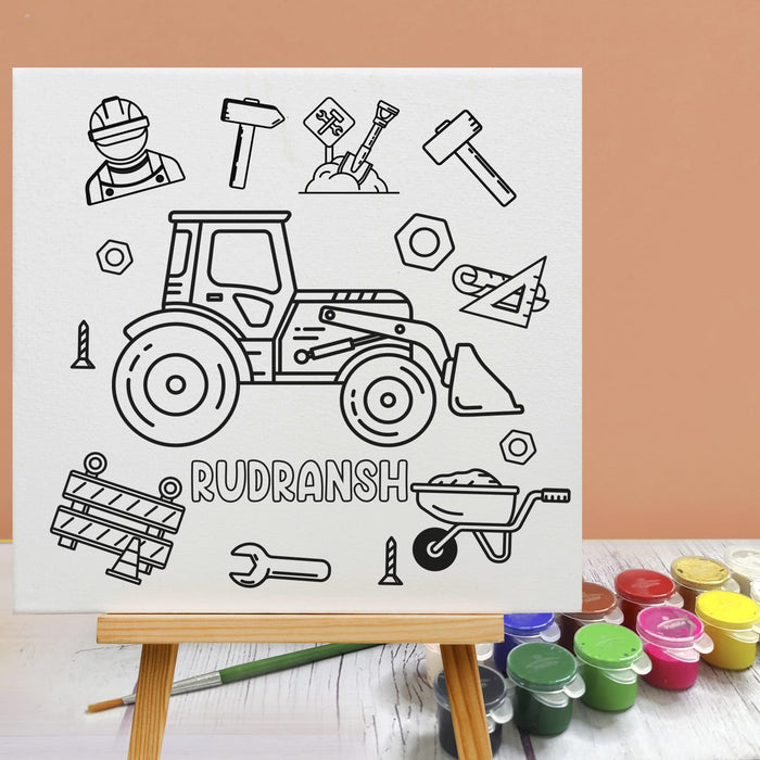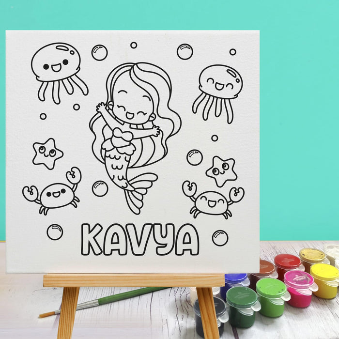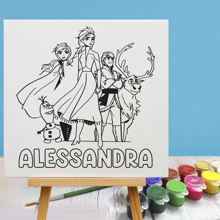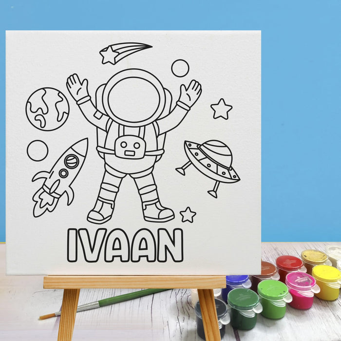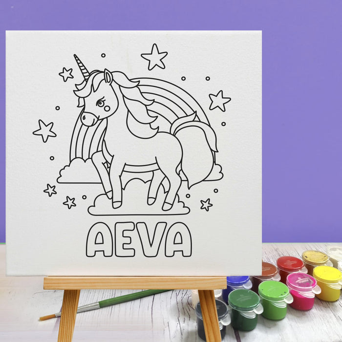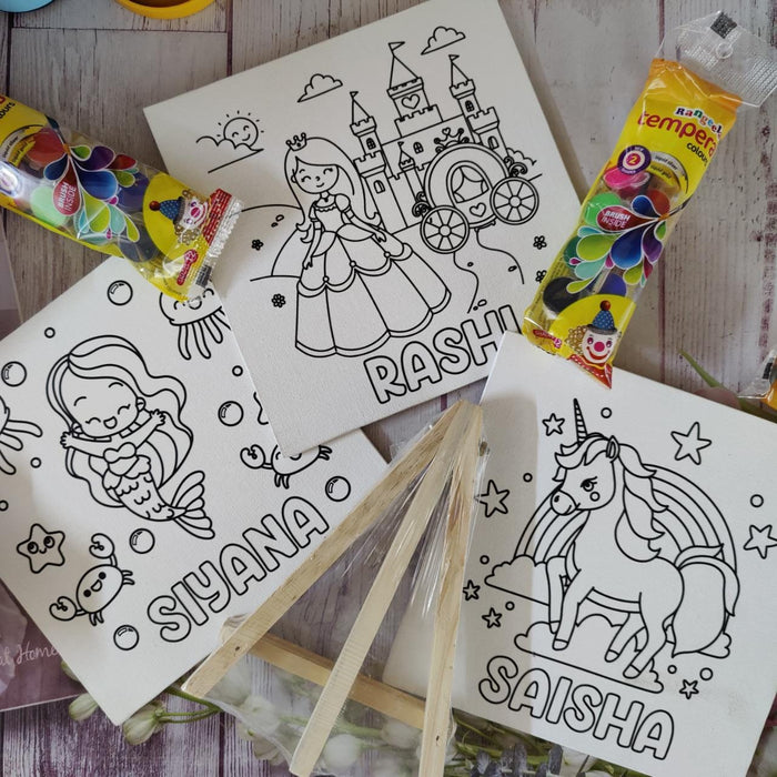 The set contains an 8 inches personalised canvas board, 12 colours paint kit with a paintbrush and a wooden stand.