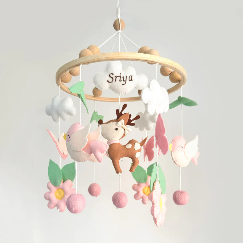 Each felt mobile hanging is designed using a wooden ring adorned with felt balls in nautical hues surrounded by hand-stitched elements including dancing fairies, bright pink hearts, stars and butterflies with a pink crown of magic in the center, that can be personalized with your little one's name.