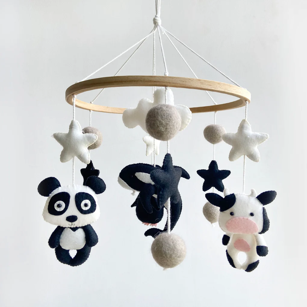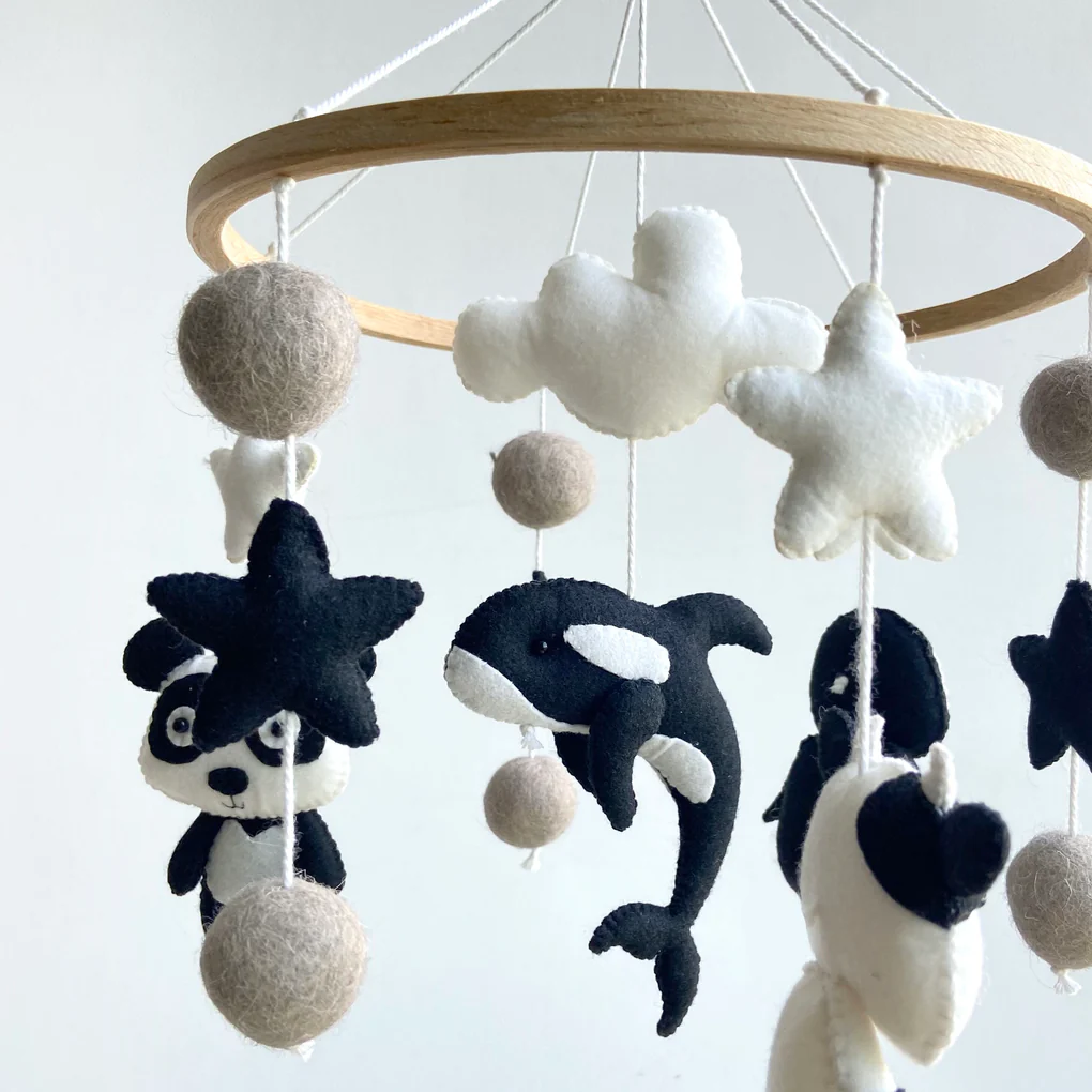 This lovely baby crib felt mobile is perfect for your little ones nursery. Completely hand made with love makes each piece unique. The mobile features a penguin, cow, whale, panda, black & white stars & stringed felt balls.