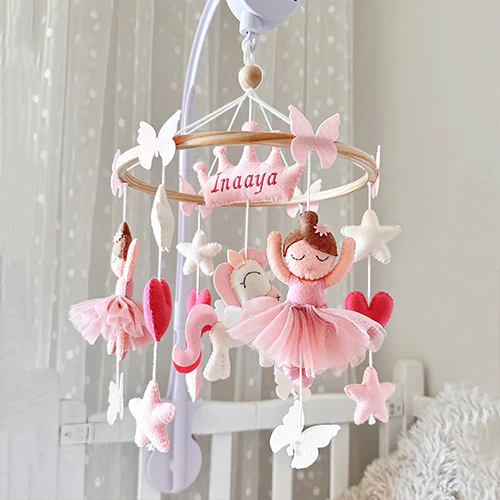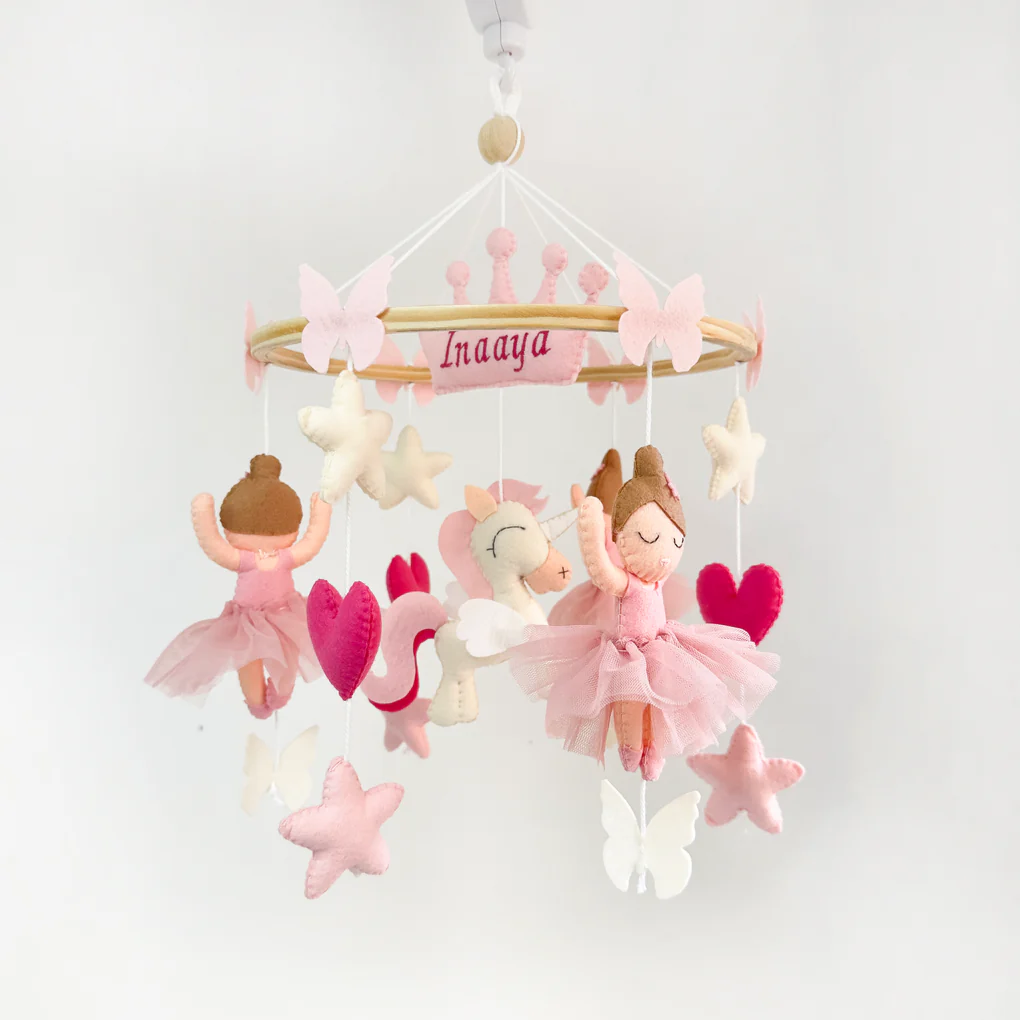 Each felt mobile hanging is designed using a wooden ring adorned with felt balls in nautical hues surrounded by hand-stitched elements including dancing fairies, bright pink hearts, stars and butterflies with a pink crown of magic in the center, that can be personalized with your little one's name.