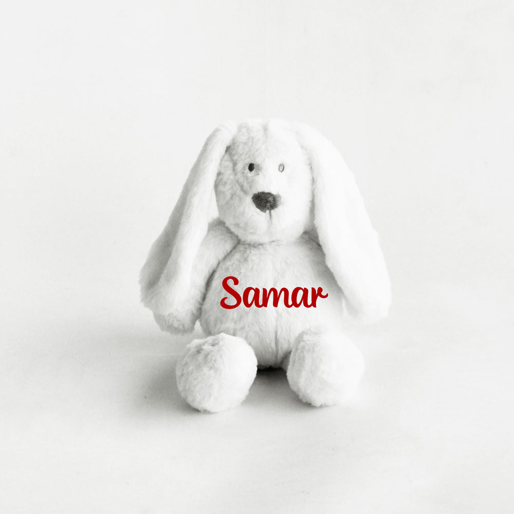 Please note: The colour of the bunny is off white. The colour of the name is Red.