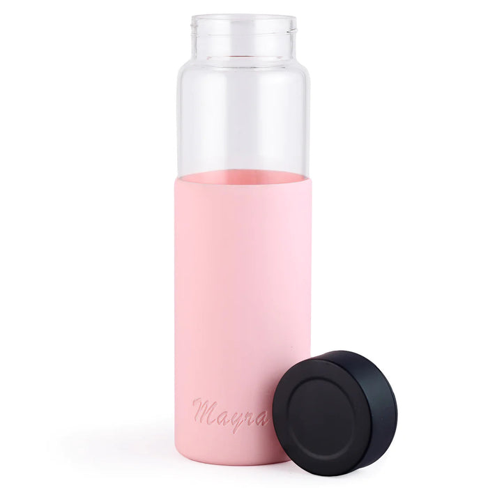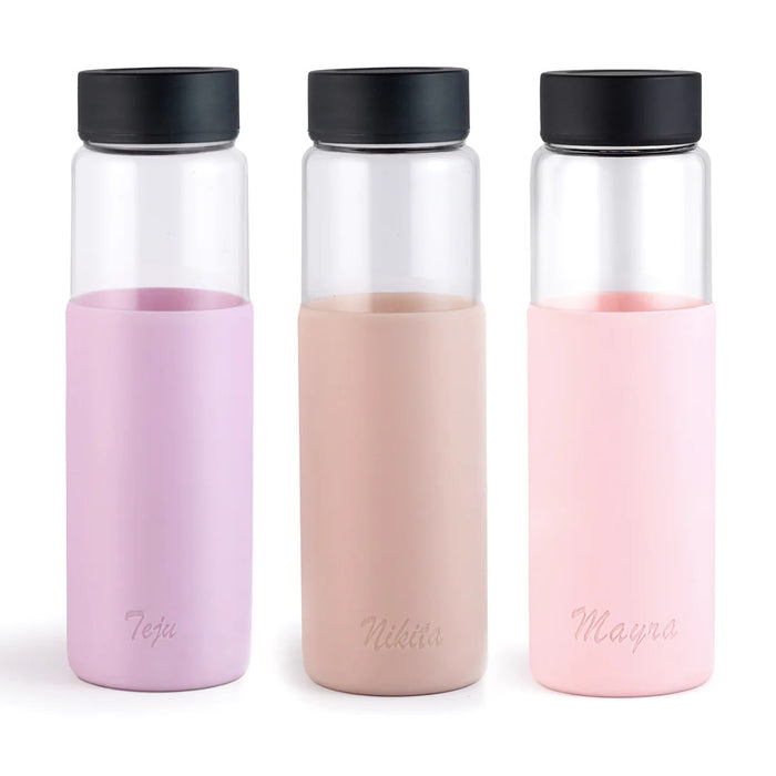 Personalized Glass Water Bottle with Silicone Sleeve in pastel colours in minimal personalization and an elegant design makes it an ideal gift for friends and family.