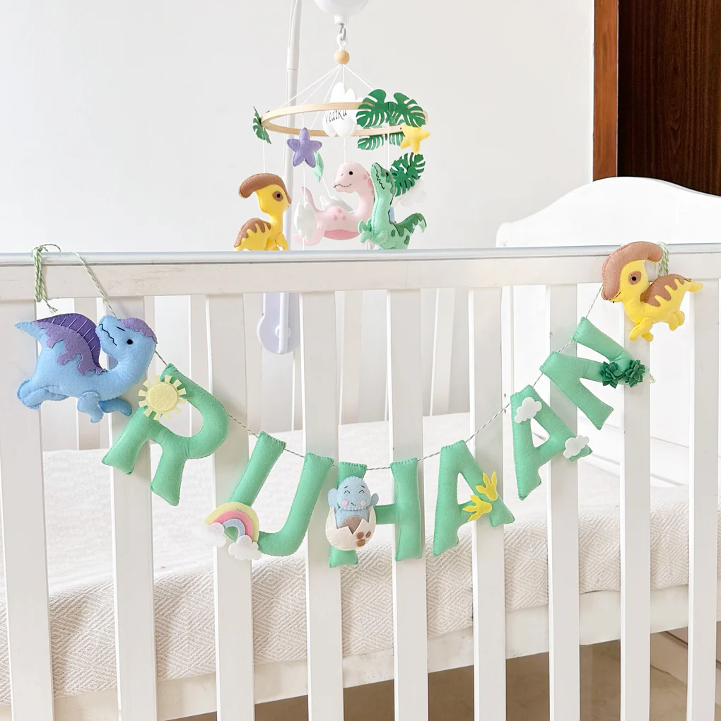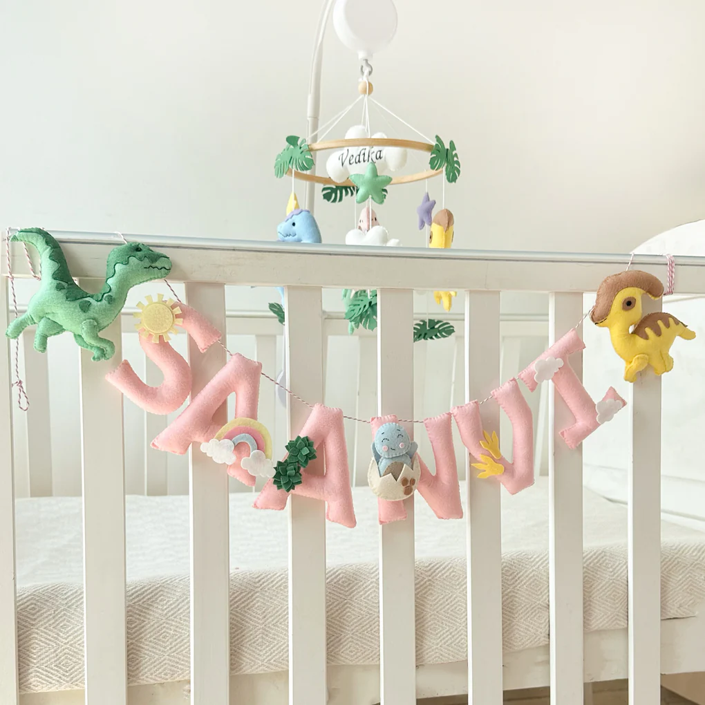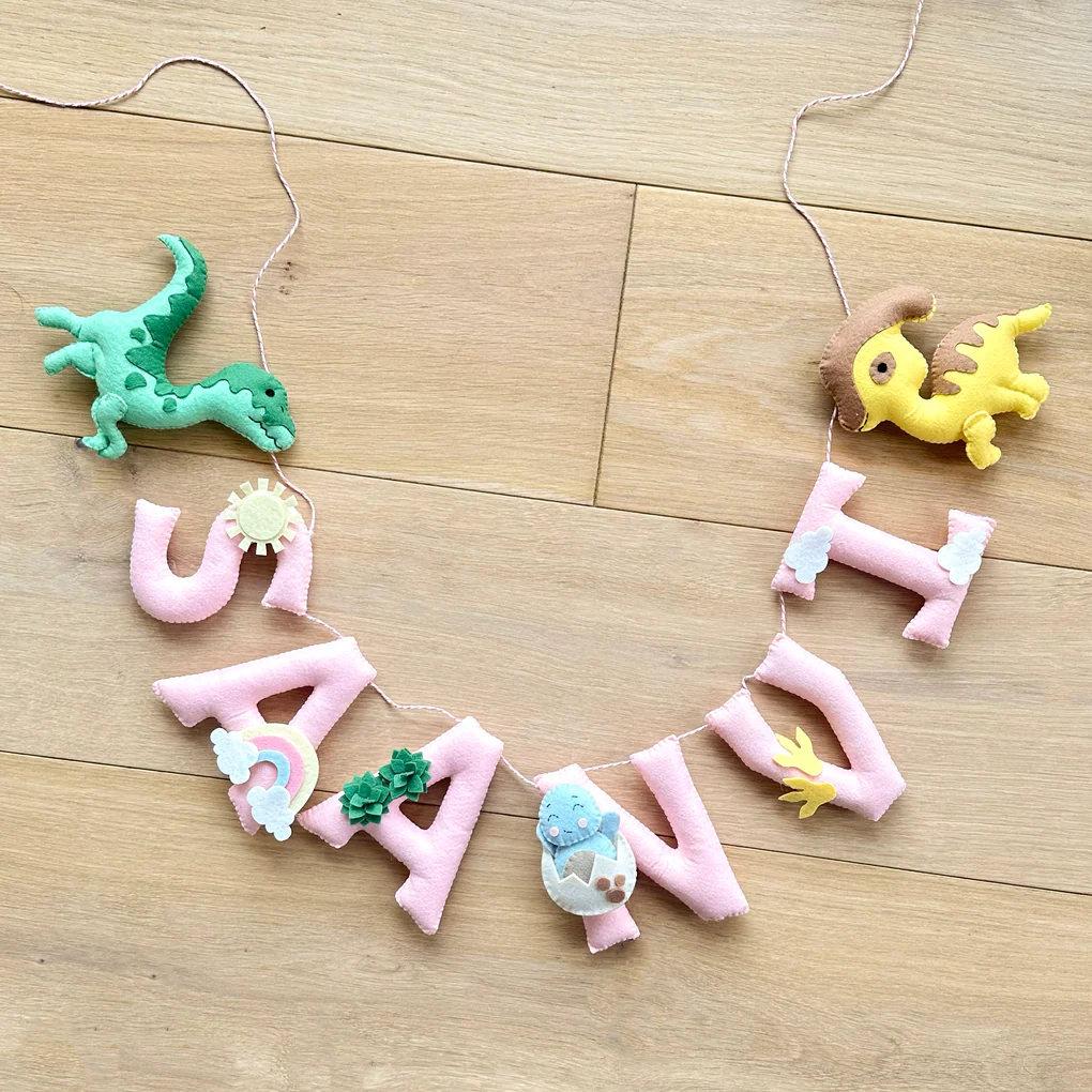Add a roar-some touch to your little one’s space with our Personalized Dinosaur Dreams Name Garland! Perfect for hanging on a wall, shelf, or crib, this charming felt banner is handcrafted with 2 dino embellishments, making it a unique and playful decor piece for any nursery or playroom.