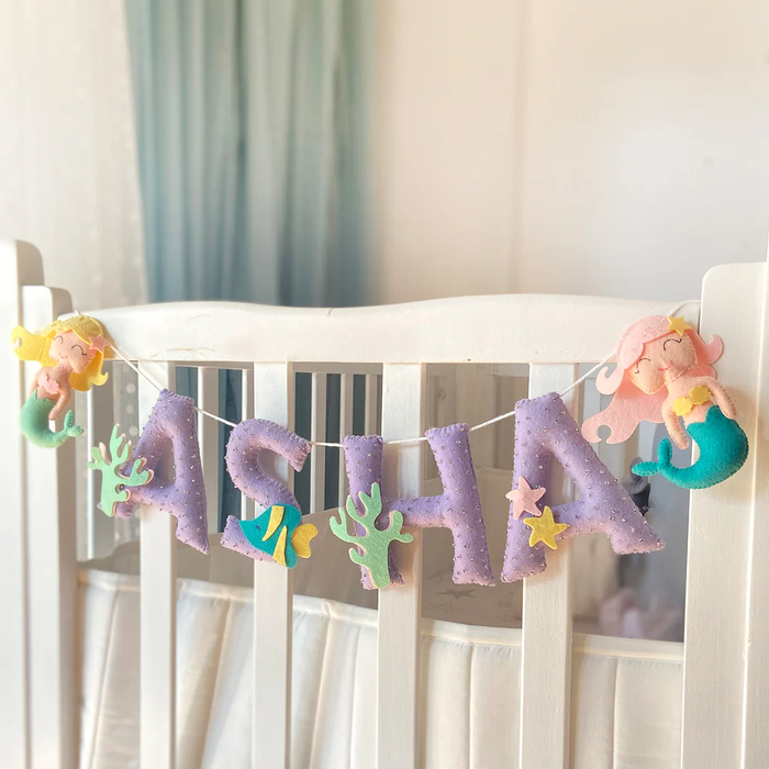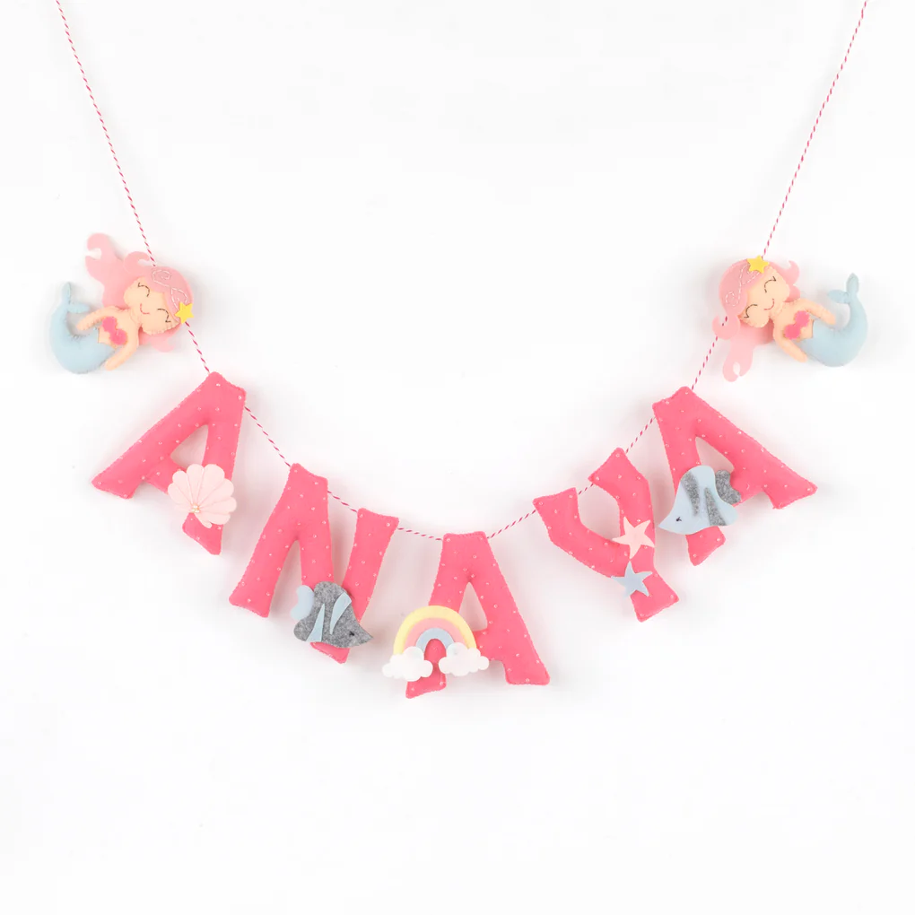 This mermaid theme felt name bunting is perfect to hang across a wall, shelf, or along your little ones cot/crib. Made from Felt Fabric