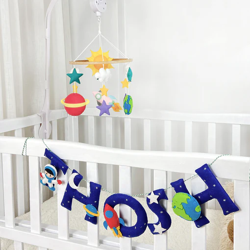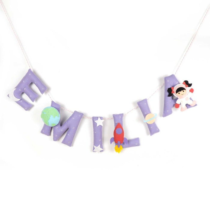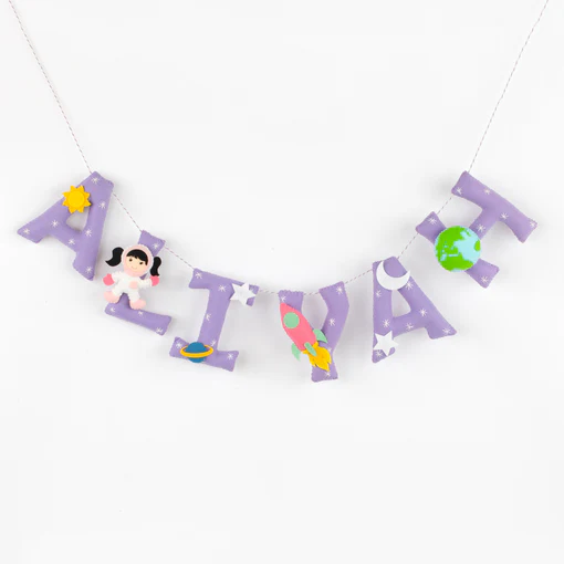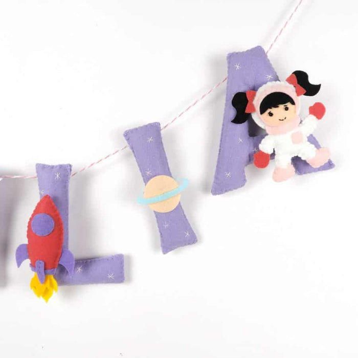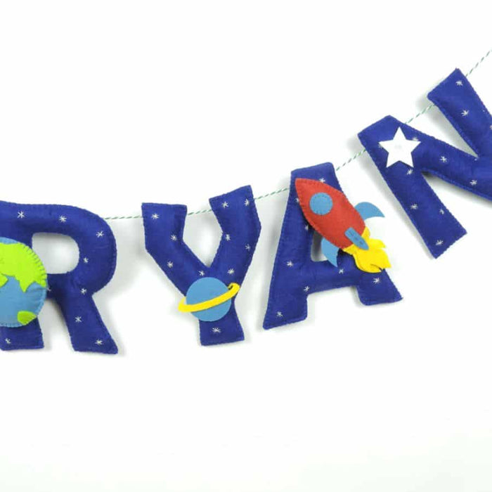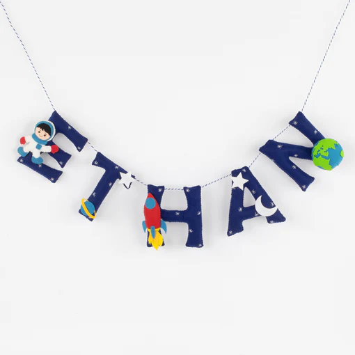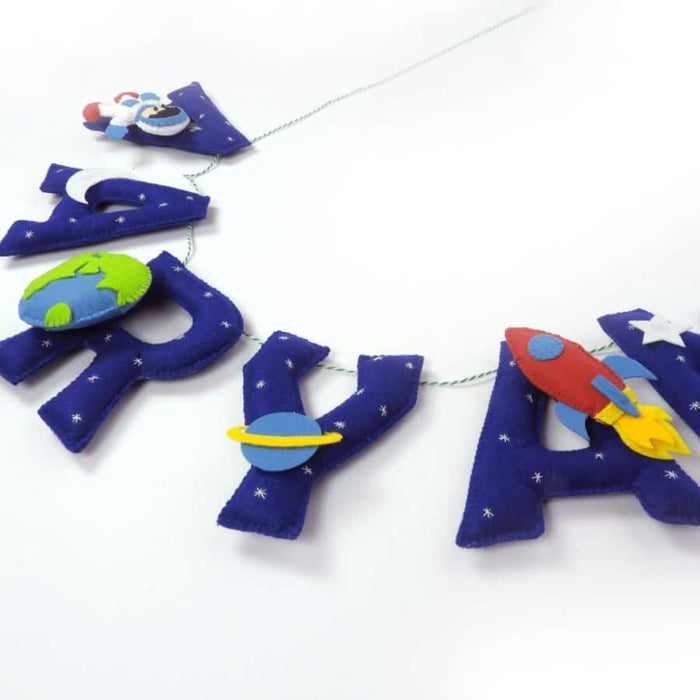 This space themed name bunting comes with hand stitched elements like rocket, spaceman, earth and shooting star on every alternate alphabet and small space elements on the other alphabets