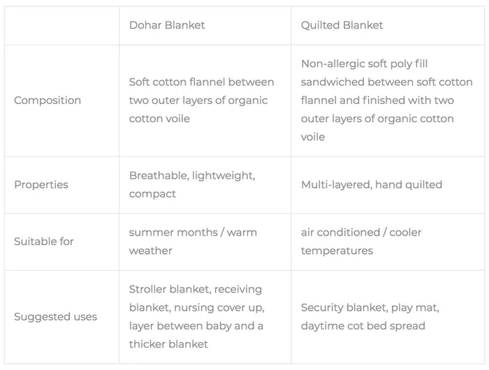 Our light and airy dohar blankets are your little one's warm weather BFF and work well as receiving blankets or stroller blankets. Our quilted blankets make sure your chubby cheekers stay warm and cosy, they work better for air conditioned and cooler temperatures.