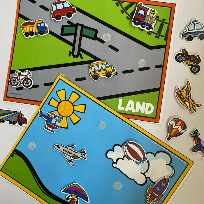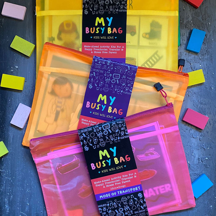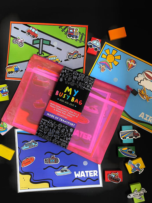 Easy to carry, compact and a fun educational activity, the Mode of Transport busy bag allows children to understand which vehicles can travel on land, air and water. The kit includes 3 thick non-tearable A4 cards in a travel friendly bag, along with 24 vehicle cutouts for their tiny hands which can be stuck & removed easily.