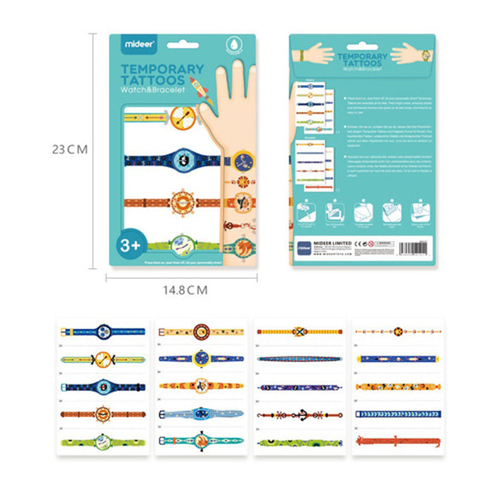 Mideer Temporary tattoos are easy to apply and remove. Simply place the tattoo and apply some pressure and peel it off. This pack includes 20 tattoos of pretend watches and bracelets. Makes for great party favors or playdates.