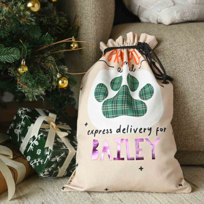 Our Christmas sacks come lined in candy stripes and personalised in foil. Perfect to give as gifts, our sacks come in a dust bag of their own making it easier to store for annual use! These handmade, high-quality pieces are ideal for larger gifts, to place under the tree! For smaller treats, we have personalised stockings that you can hang!