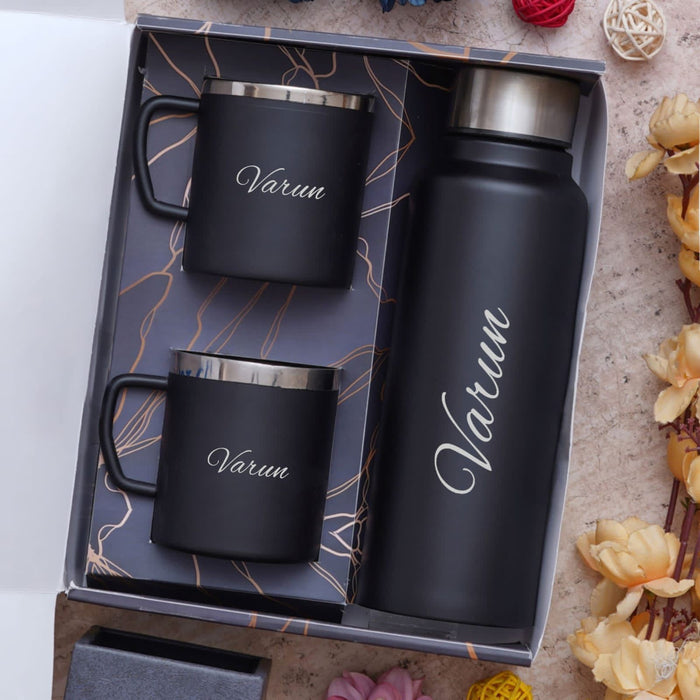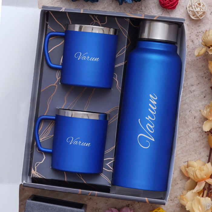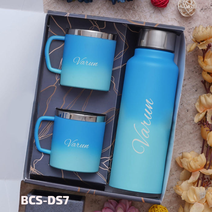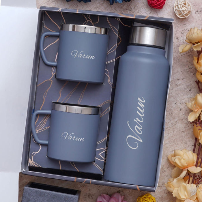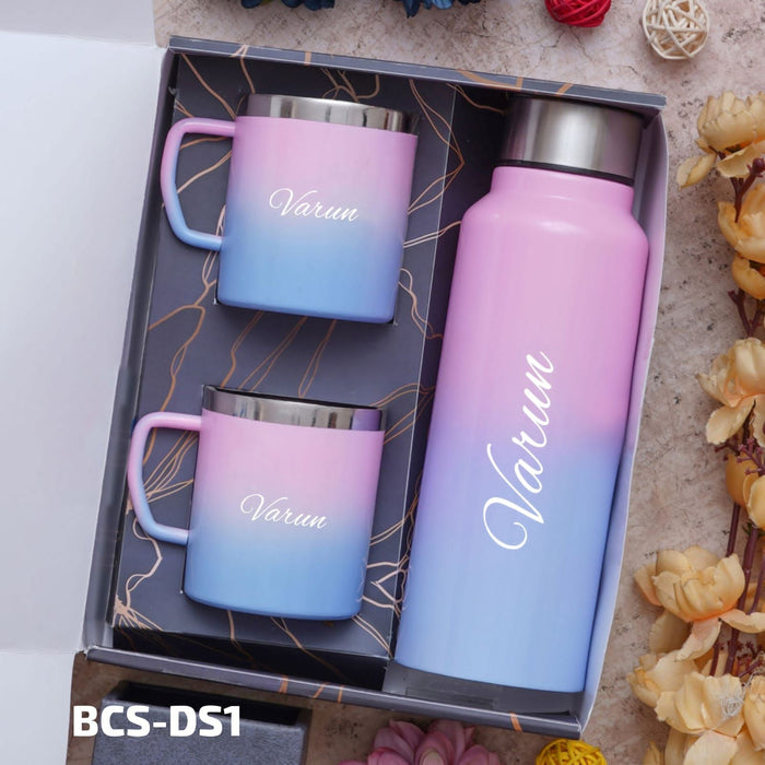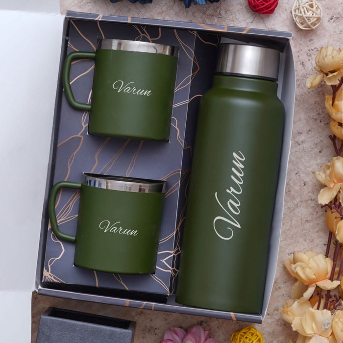 Personalised Gift Set in Assorted Colours | Classic Steel Bottle with 2 Mugs