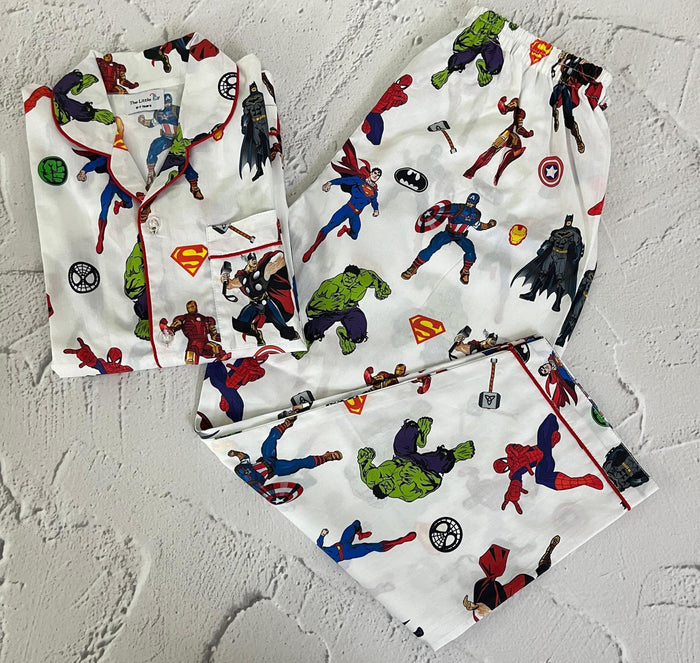 This superhero set includes a full-sleeved collared shirt with button front opening and a pyjama with an elastic waistband for a comfortable fit. The shirt can be made half sleeves upon request.