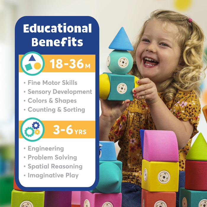 It’s never too early to introduce your child to early learning STEM toys! Blockaroo Blocks connect like magic, thanks to a unique magnetic connection system. They rotate 360-degrees, allows your child to explore shapes and colors with soft foam blocks that are safe and easy to handle, creating a multi-sensory experience that they'll love! Blockaroo are sturdy blocks which are designed to grow with your child. Younger children love the bright colors, playful sound and easy-connect building system that encourages tactile learning and shape recognition. Older children are fascinated by the endless building possibilities provided by the 360-degree rotation capability and the mix and match nature of these blocks. Blockaroo blocks are also bath-friendly and can transform bath time into an experience parents and kids look forward to!
