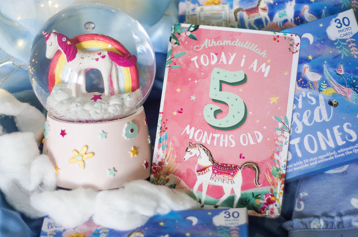 From your baby’s first taste of ‘tahnik’ to their first ‘bismillah’ - celebrate their blessed milestones with these whimsically illustrated photo cards, featuring majestic masjid and animals from the Qur’an. Packaged in a beautiful clamshell box and made from sustainably sourced materials.