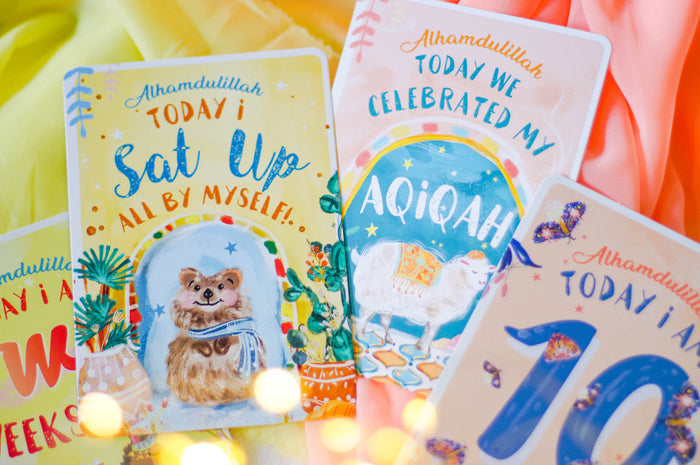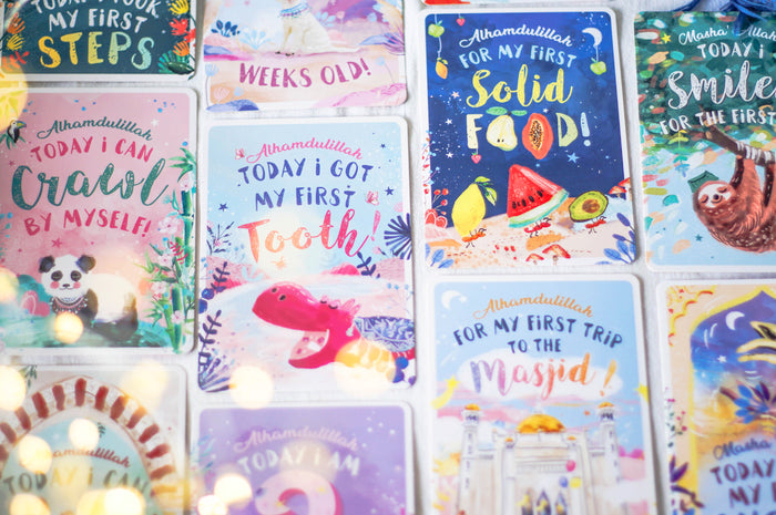 Baby’s Blessed Milestone Cards are meant for the new Muslimah mamas and papas to be, who are looking for a sprinkle of Deen-dust to celebrate their baby’s moments with. The beautifully illustrated cards reflect the color children bring to our lives, the beauty in nature & the twinkle in the stars as we remember Him in all the magical moments we are blessed to have.