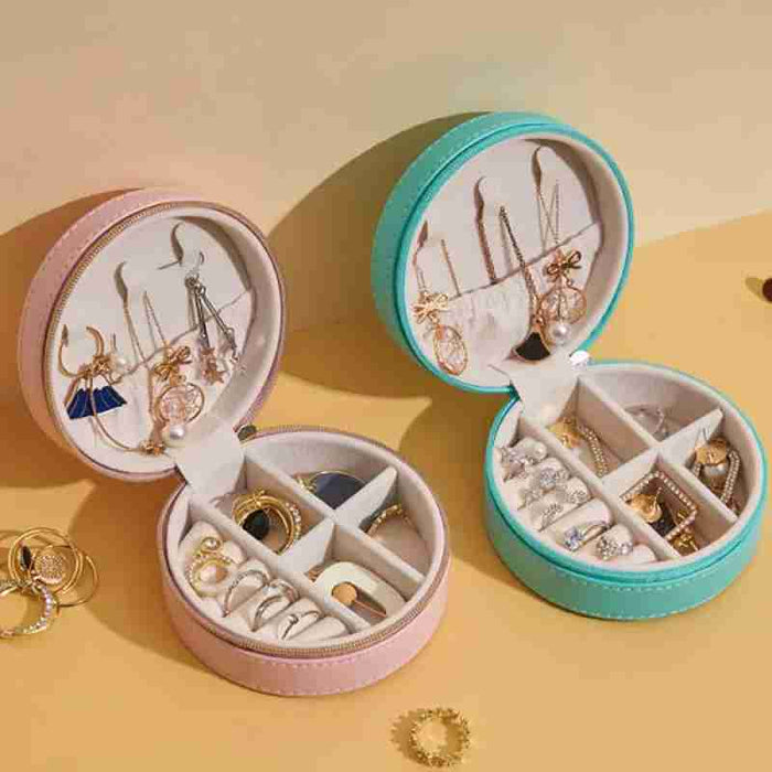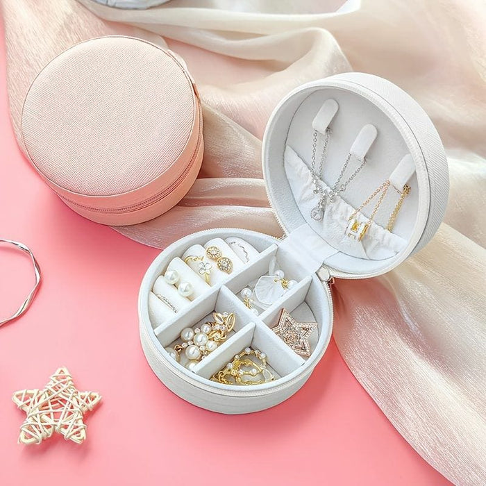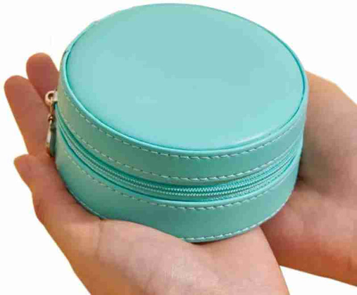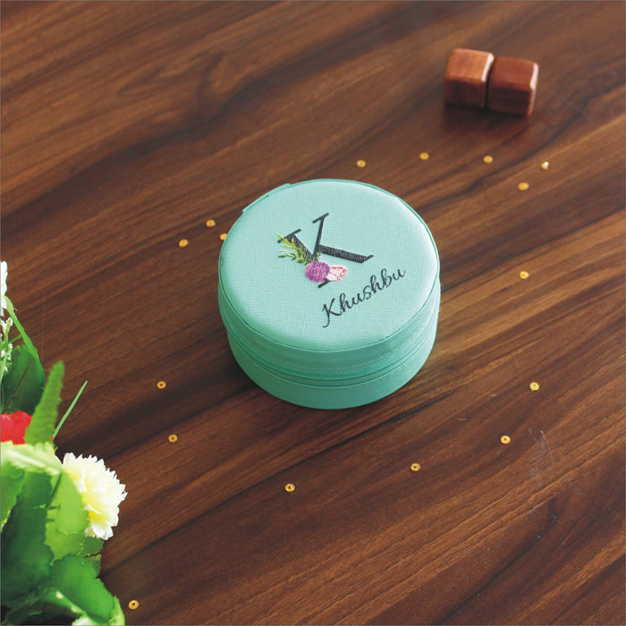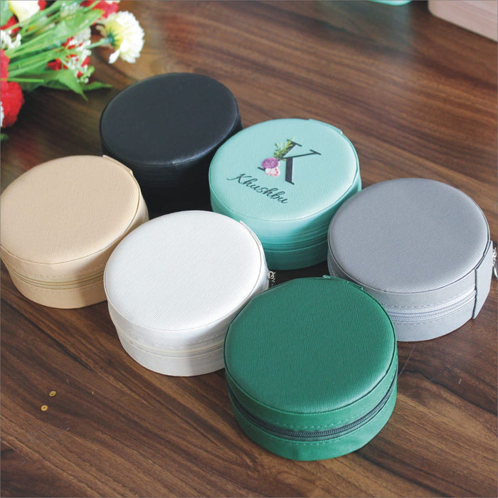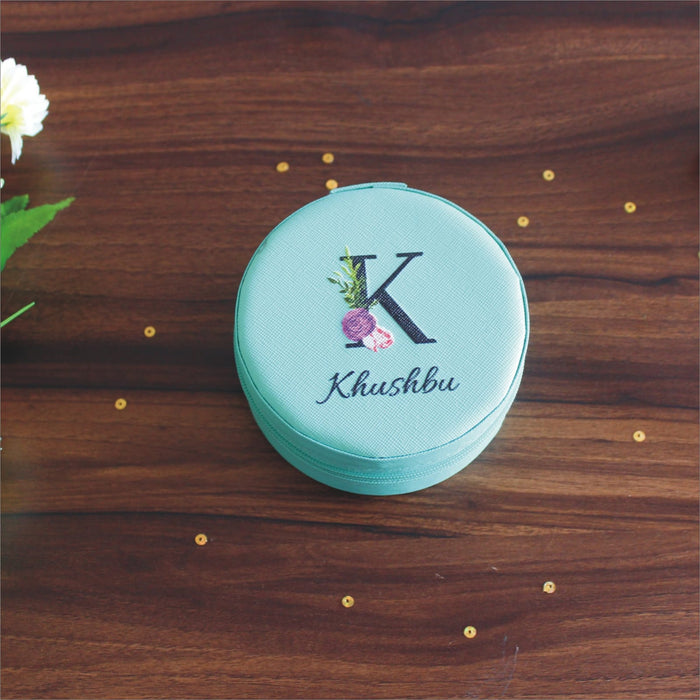 A circle shaped jewellery storage box to store dainty jewellery pieces and accessories while on the go. Customised with your initial and name