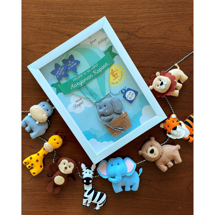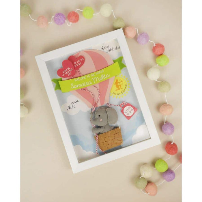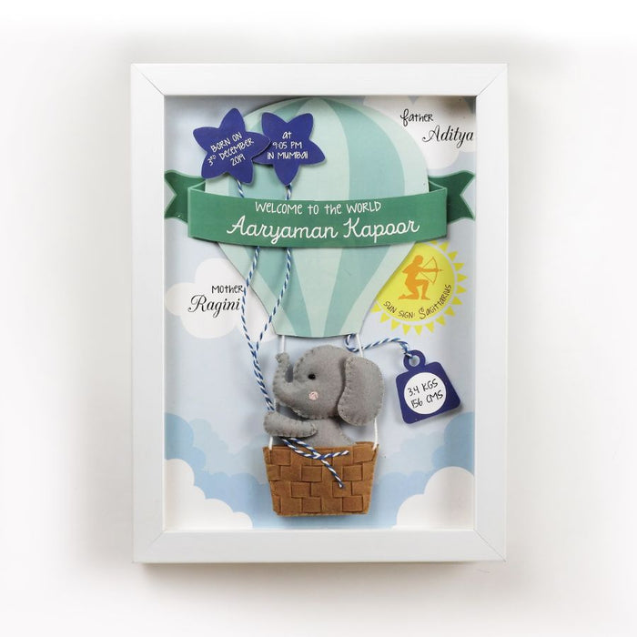 This stunning bespoke frame, is carefully crafted to include all the special details, to commemorate the birth of a little one. It is a perfect to welcome a new baby or decorate a nursery. This frame has been handmade by layering paper and a hand stitched felt elephant in a hot air balloon to give a beautiful 3D effect. It comes in two colour variant options.