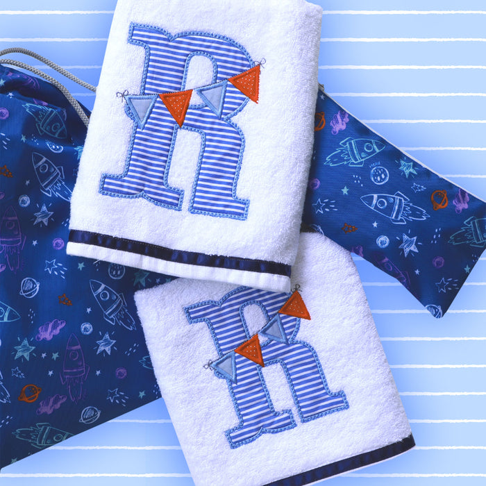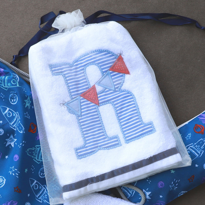 This super cute initial themed gift hamper makes for just the right gift for a boy! Comprising of one bath towel, one face towel, one string bag and one pencil pouch - its all that he needs to get style ready!
