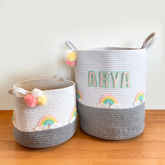 This soft, sturdy handmade gift basket come with handles and is embellished with rainbows and colourful pom poms. It can be used as a bath basket, nursery bin, for clothes organisation or for toy storage as well.