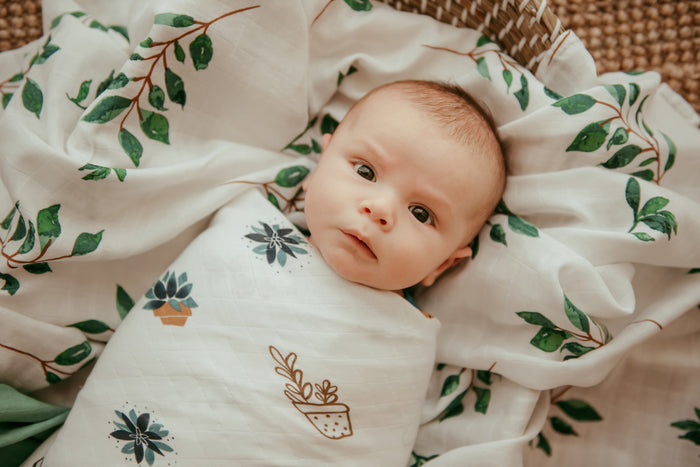 This exquisitely soft fabric is woven using a combination of organic cotton and rayon and is naturally hypoallergenic and snug. Rayon made from bamboo fiber has the added bonus of being more water absorbent and breathable than regular cotton, cooling your baby on hot, humid days, while also working as a great base to keep your baby warm and snug during cold winter nights. Generously sized, our muslins are versatile and can be used as a swaddle, a blanket for the stroller, or a cover for the changing table.