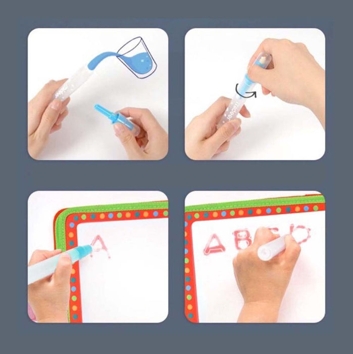 This book comes with 6 reusable coloring pages and 1 water pen. Just fill water into the water pen and start to draw, the colors change when in contact with water. Once it dries, the color fades up so the book can be reused multiple times.