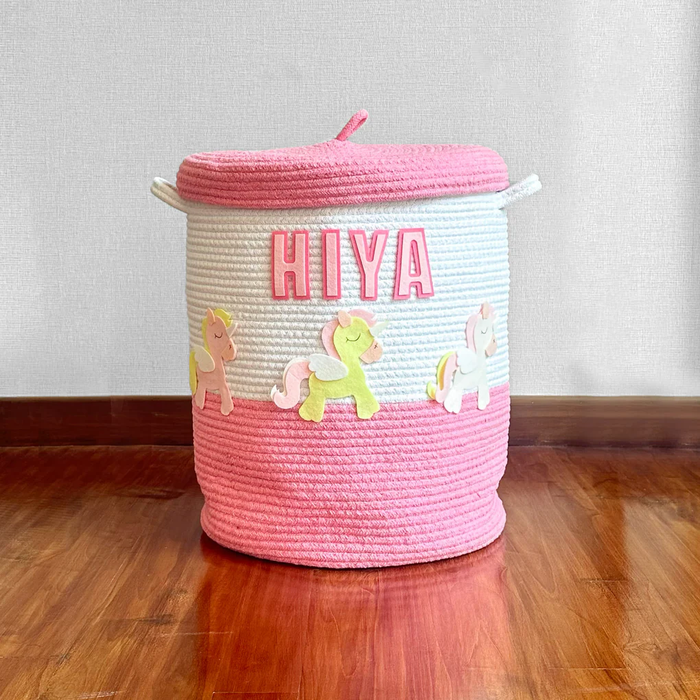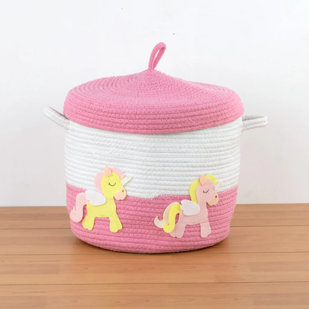 Elevate your little ones nursery and playroom organization with our soft, sturdy, and durable cotton rope storage baskets, now featuring a convenient lid. This chic and magical design complements any nursery decor. Handmade from premium cotton rope and adorned with felt unicorn cutouts, these baskets are both stylish and functional.