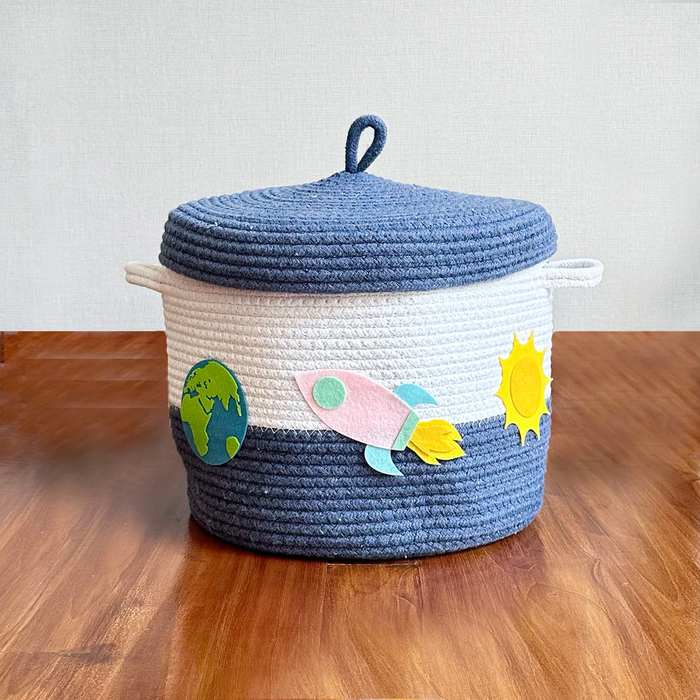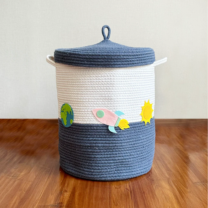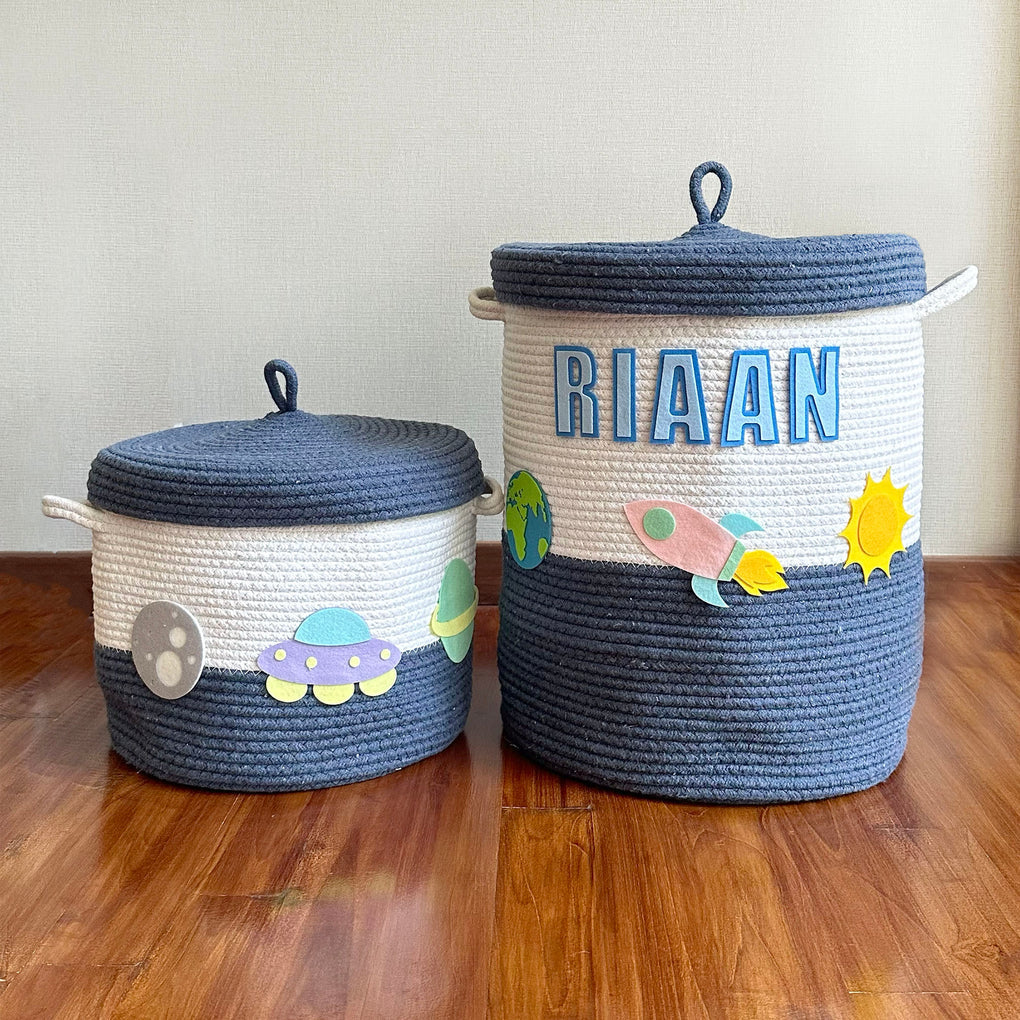 Solar System Navy Blue Rope Basket with Lid- Set of 2