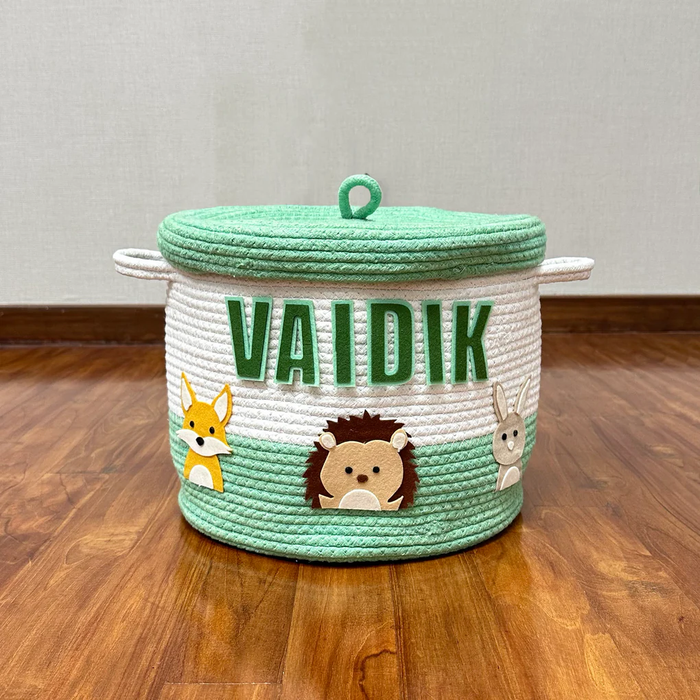 Woodland Animals Green Rope Basket with Lid- Set of 2